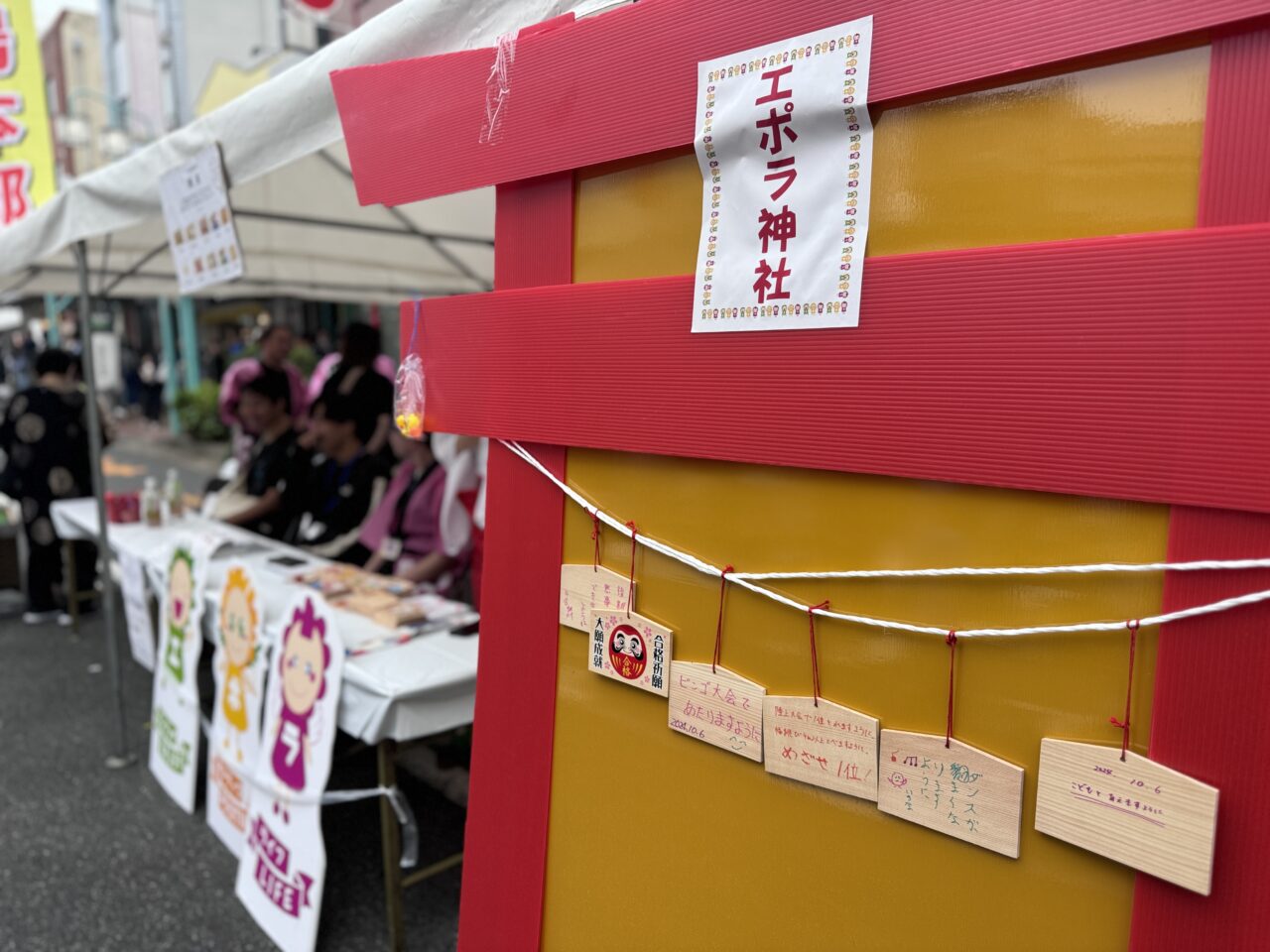 ホコ天本部では、迷子受付、そして目玉イベントのビンゴカード販売など、お祭りの活動の中心を担います。お困りごとがあったらまず本部へ!そして「エポラ神社」は今年も登場。絵馬に願いを託しましょう♪