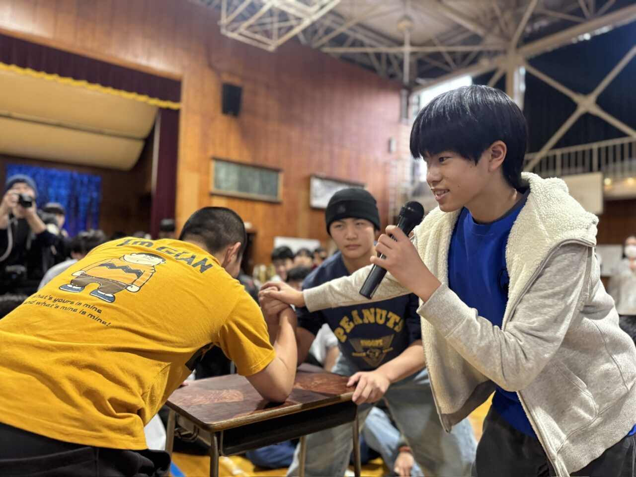 筆者が現地に到着した時は、腕相撲大会予選会のタイミング。四中最強の腕相撲界の頂点は誰か。多くの生徒がエントリーした予選から白熱した戦いが繰り広げられました!