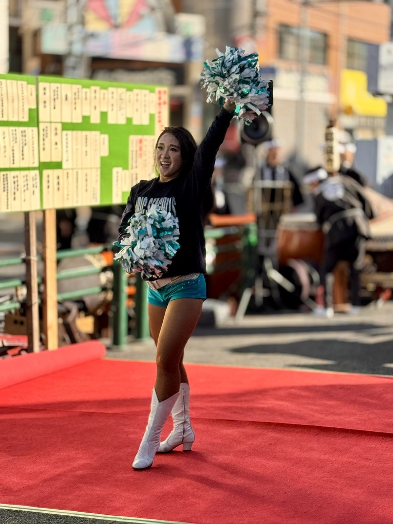 続いて会場を華やかに彩ったのは、1月3日のライスボウルで惜しくも準優勝となった、アメリカンフットボール・オービックシーガルズのチアリーダー「SEA-Cheer」の皆さん。