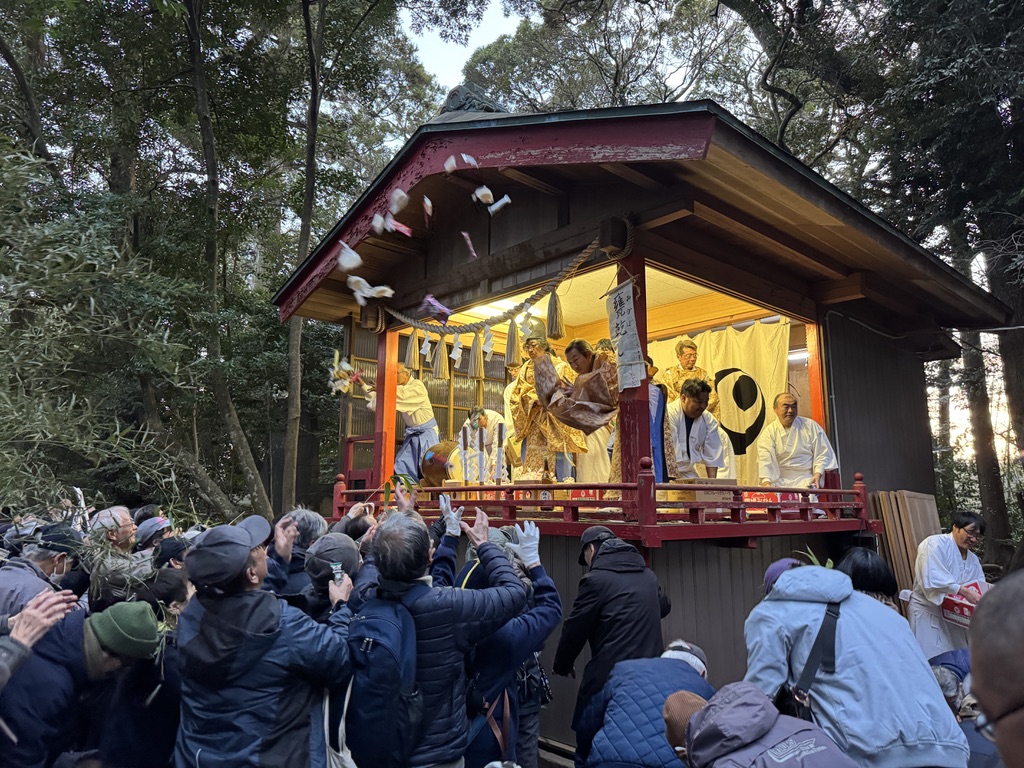 最後は餅まきの時間です。夕方の時間帯ということもあり、子どもたちも集まってきました。神楽殿と本殿からたくさんの餅やお菓子が撒かれ、境内は熱気に包まれました!