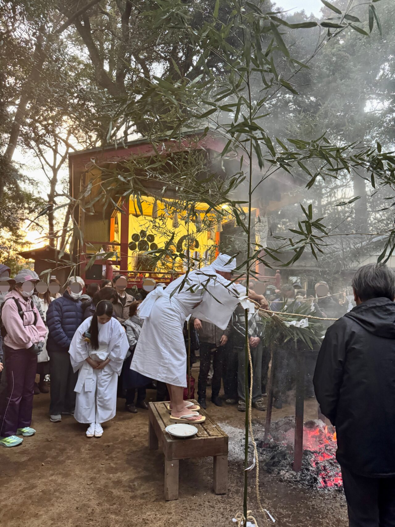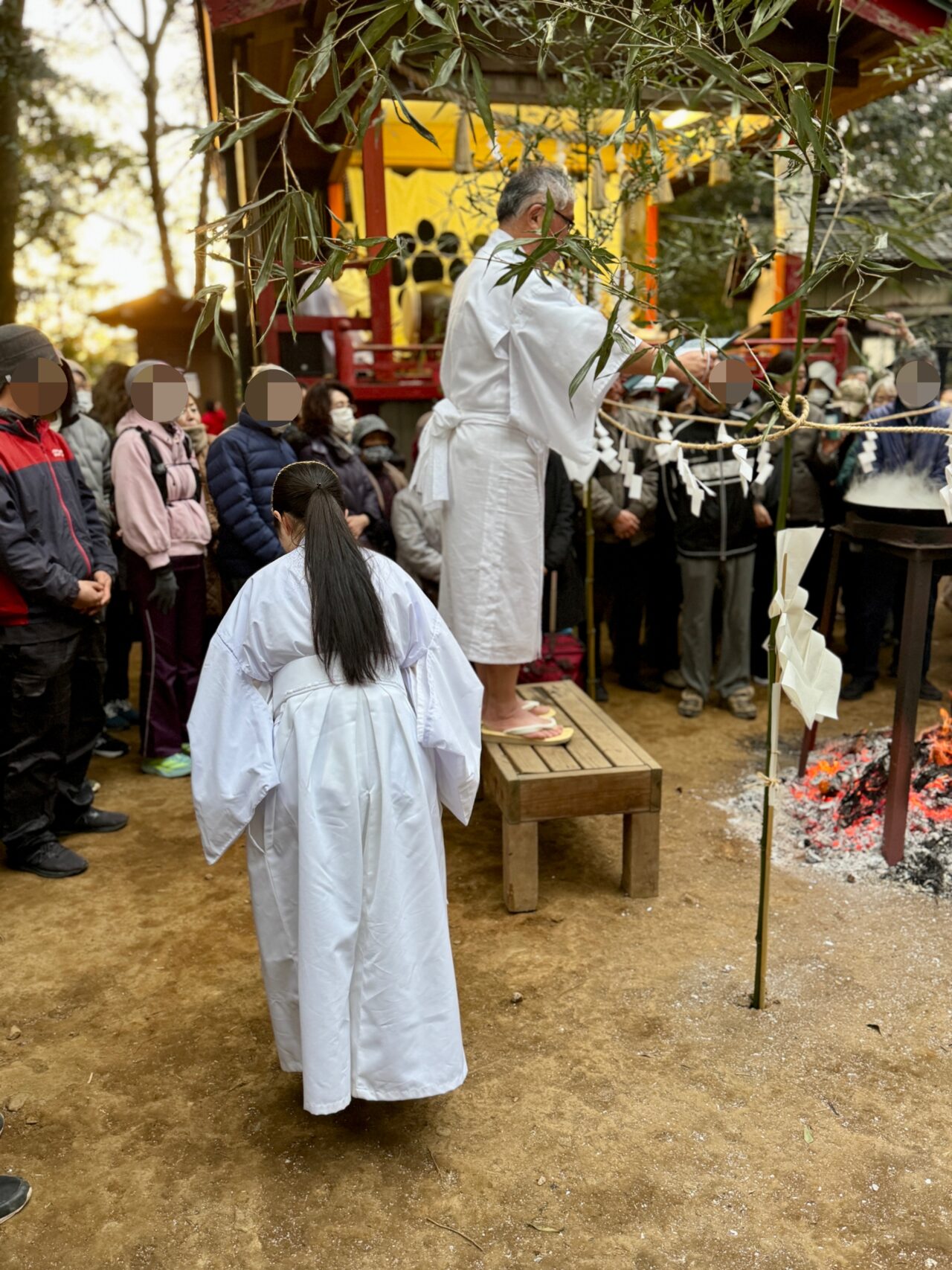 佐藤宮司の奥様と娘さんは、神職の資格を取得されたと聞き、娘さんにその理由を尋ねると、「普段は明るく楽しい父が、神事に真摯に向き合う姿を見て、改めて尊敬の念を抱いたから」と教えてくれました。今回の湯立て神事での付き添いも、巫女ではなく(資格を持つ)娘さんだからこそ務められる、特別な役割なのだそうです。