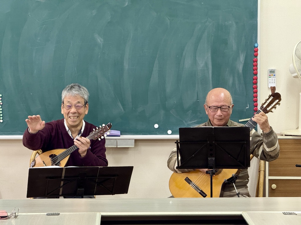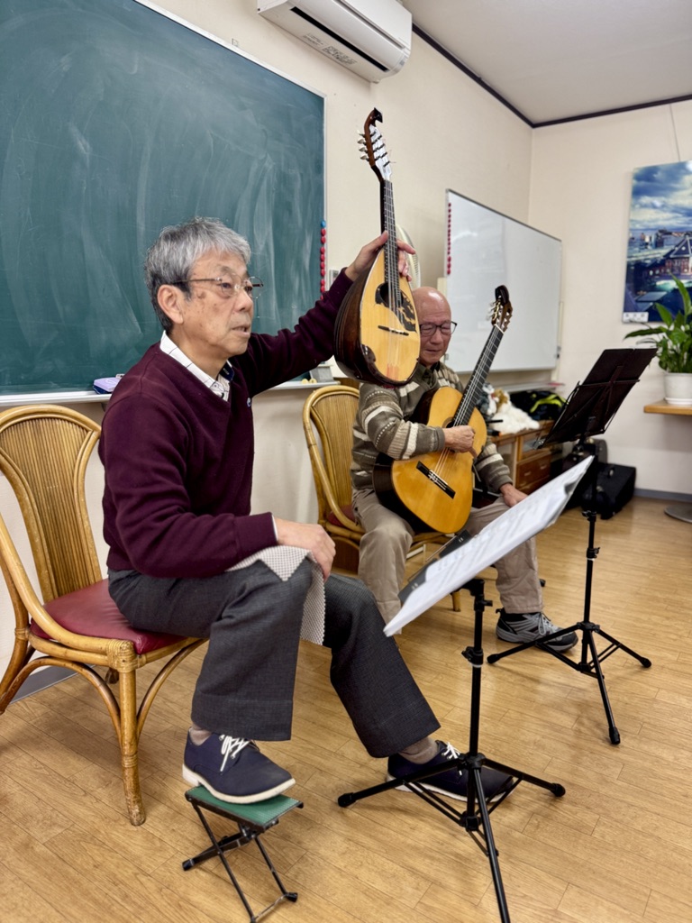 この日のゲストは、地域で活動する「扇マンドリンクラブ」の柳沢さんと葉賀さんです。「皆さんの交流会に呼んでもらえて嬉しいです」という挨拶とともに、ギターとマンドリンの優しい音色が響き始めました。