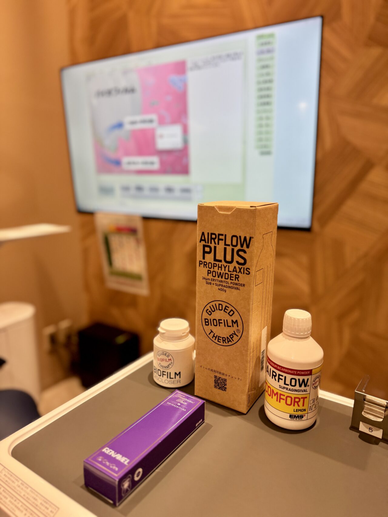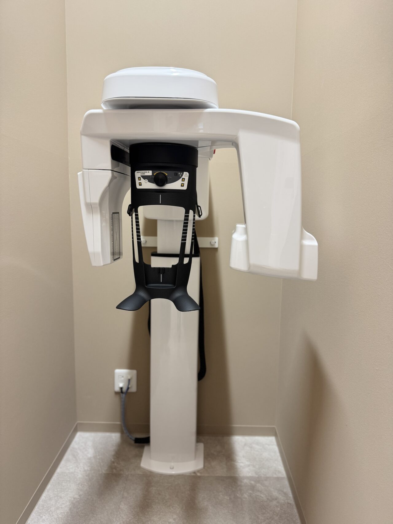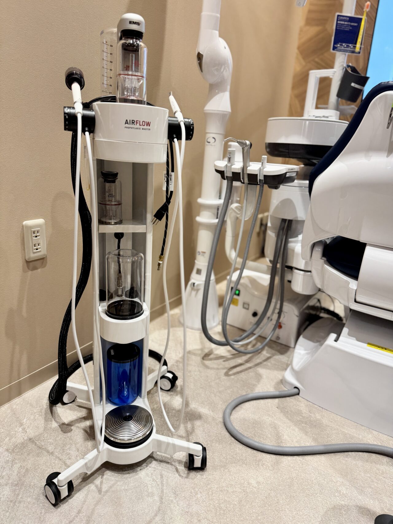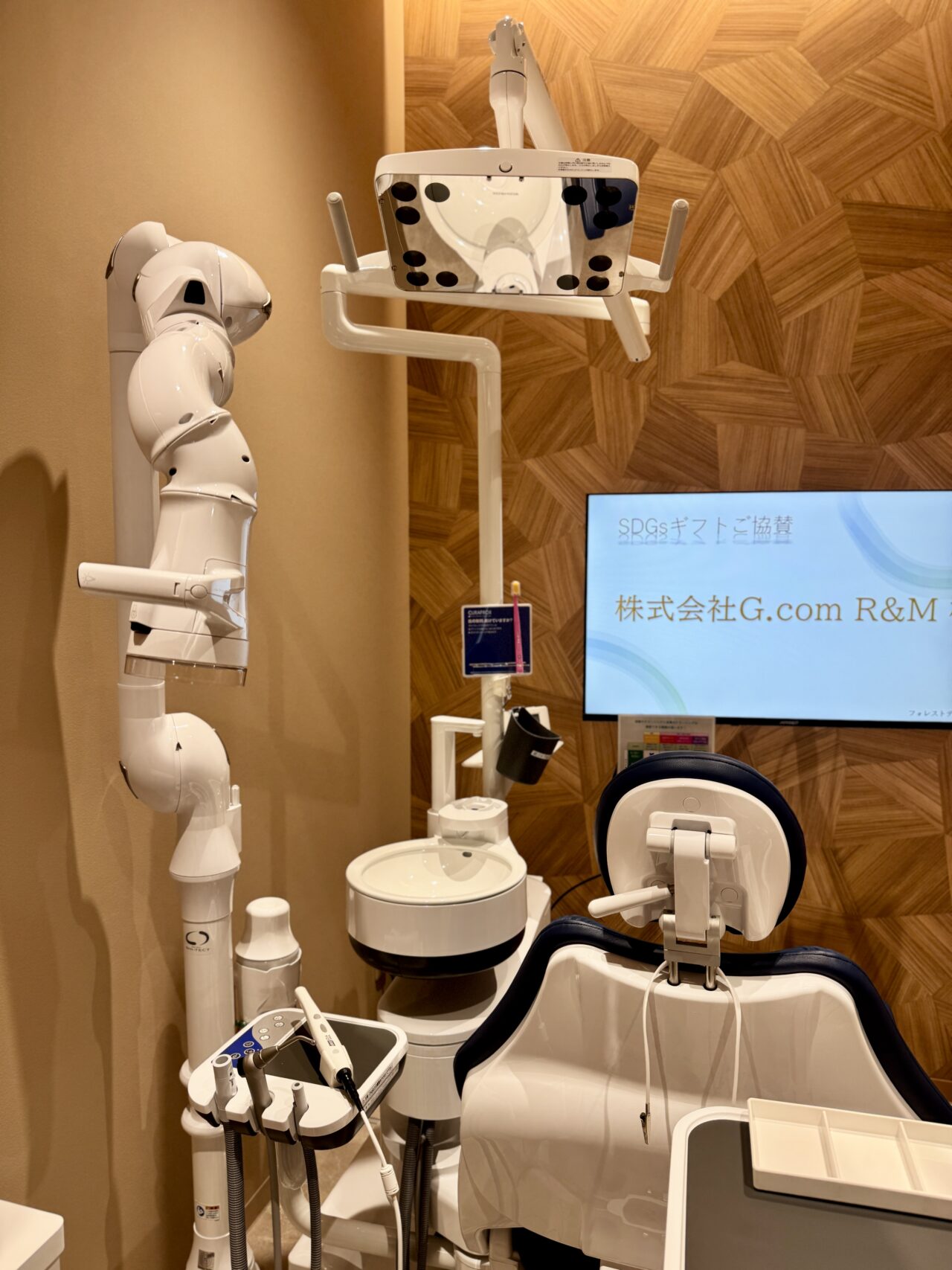 院内に一歩足を踏み入れると、すべてが真新しい最新機器で揃えられた清潔感あふれる空間が広がっています。 中でも目を引いたのが、写真左にある「くねくねした不思議な機械」。実はこれ、お口の外で使う、強力な「バキューム」なんです! 歯を削る際に出る目に見えない水しぶきや粉塵を、空中でダイレクトに吸い込んでくれる優れもの。これならウイルス対策はもちろん、削りカスが顔にかかる心配もありません。「見えない場所まで徹底してクリーンに」という姿勢に、新しい歯医者さんならではの大きな安心感を感じました。