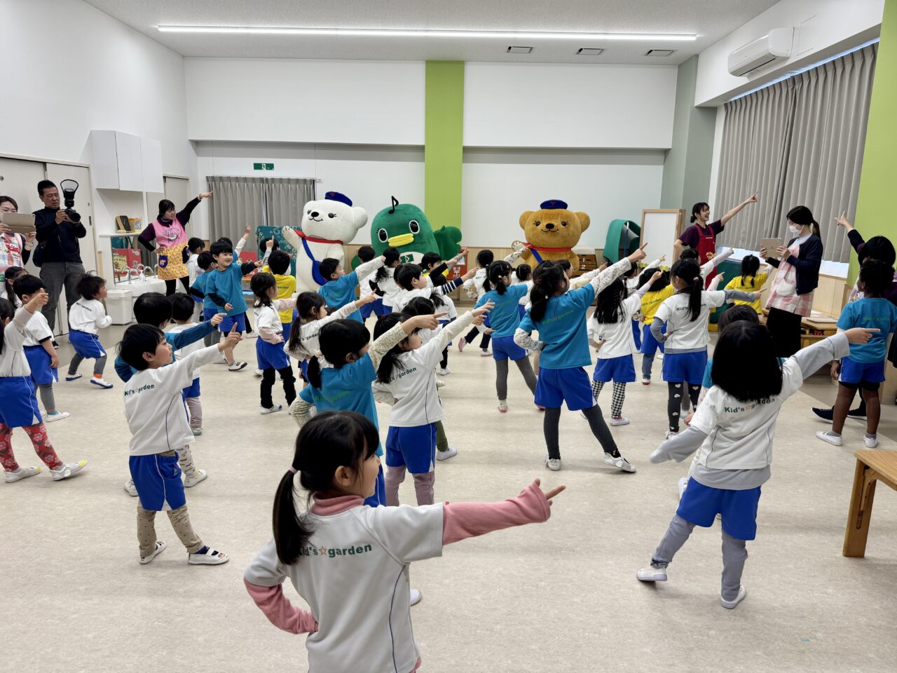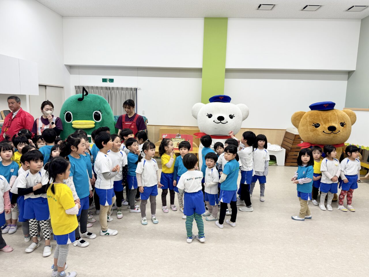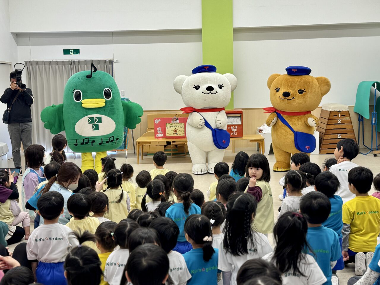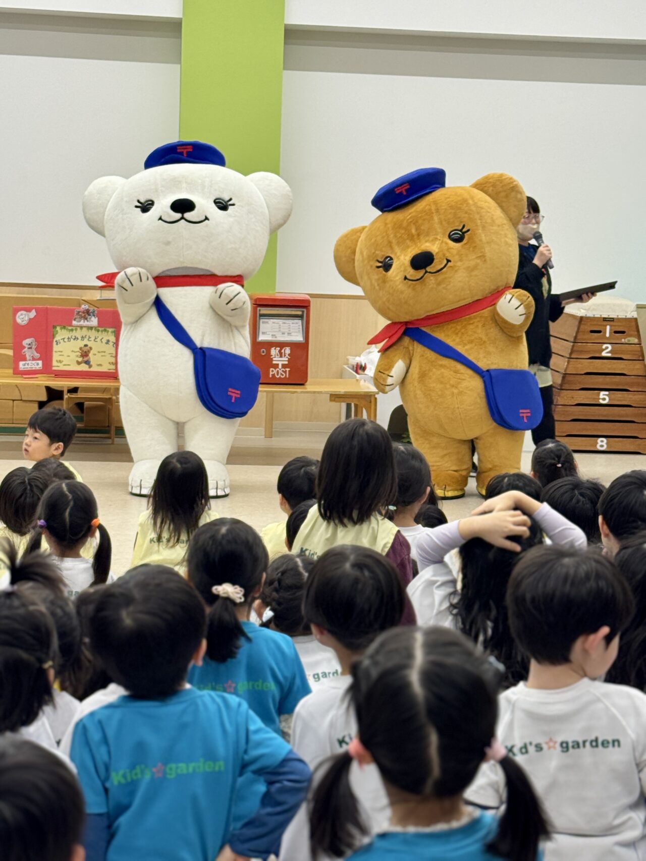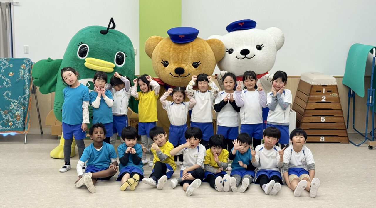 この日、園のホールに森の郵便局からやってきた「ぽすくま」、習志野市のイベントには初登場の「ぽすみるく」、そして習志野市公式ご当地キャラクター「ナラシド♪」が登場すると子どもたちは目を輝かせて大喜び!