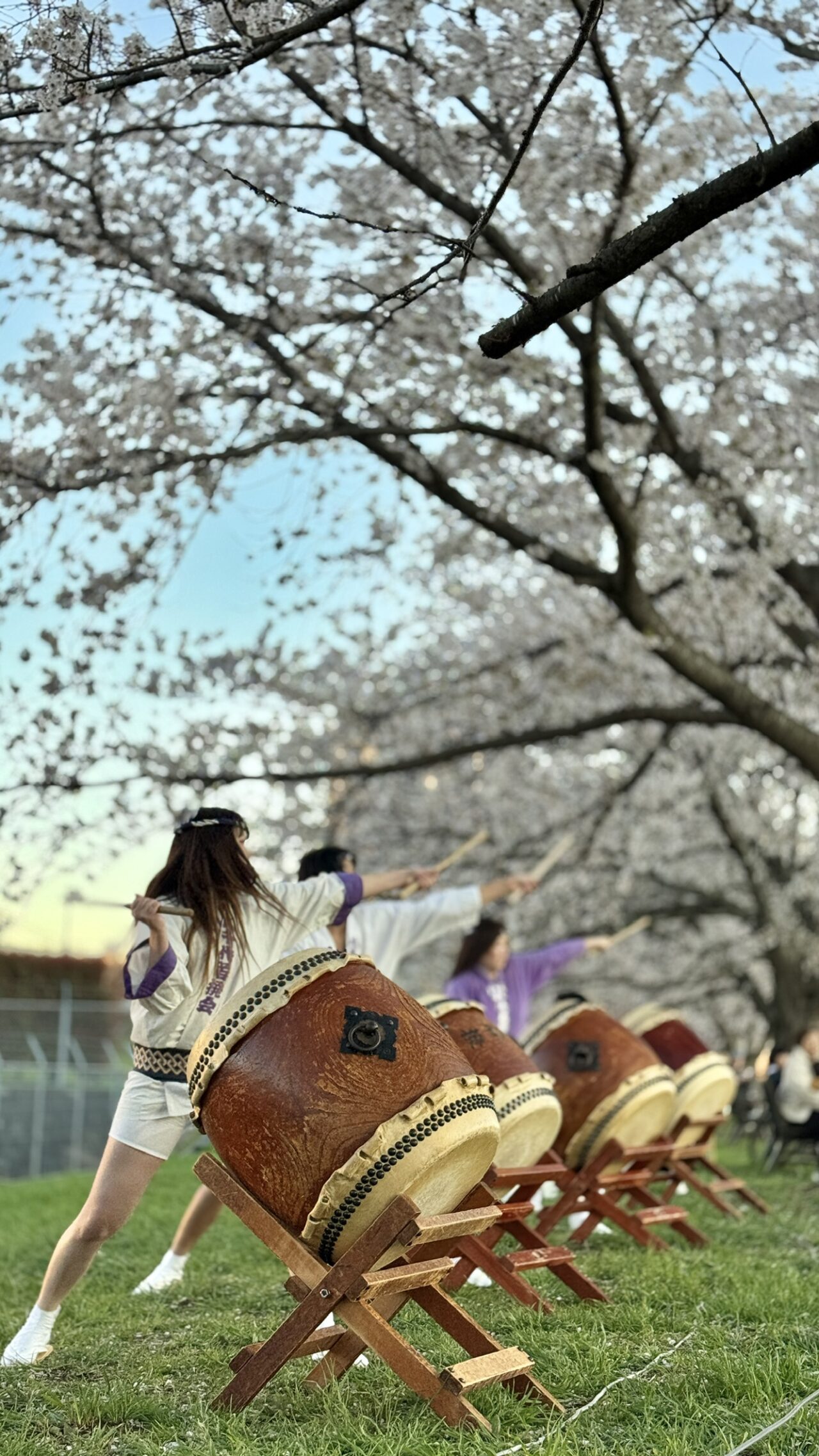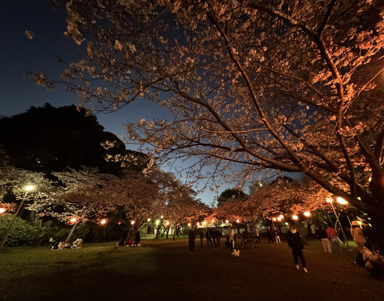 橋を渡ったさくら広場では、キッチンカーでお腹を満たしながら夜桜色にライトアップされた広場の空間を楽しむ人たちの笑顔で溢れていました。