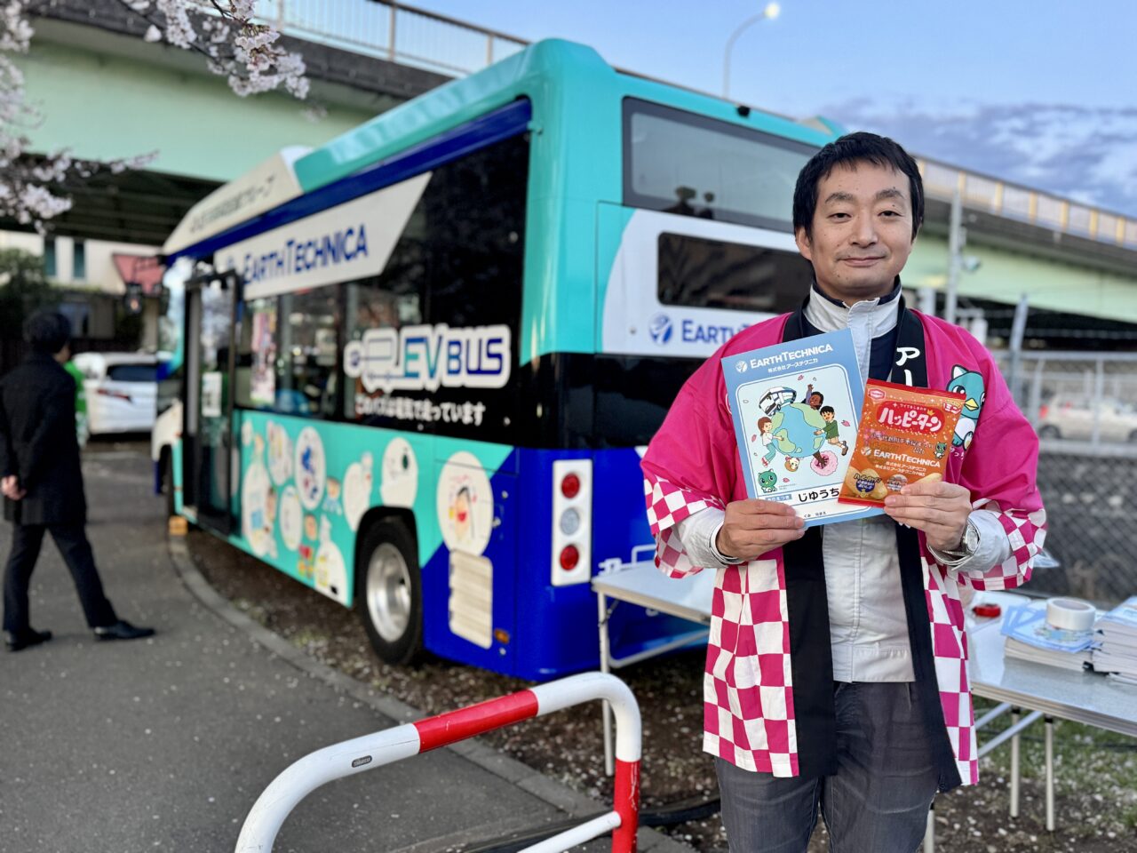 このエコライトアップには、八千代に工場を持つ(株)アーステクニカさんのEVバスが欠かせません。このバス、ただのラッピングバスではなく、現在、実際に駅から会社までの往復に使用されている車両なんです!