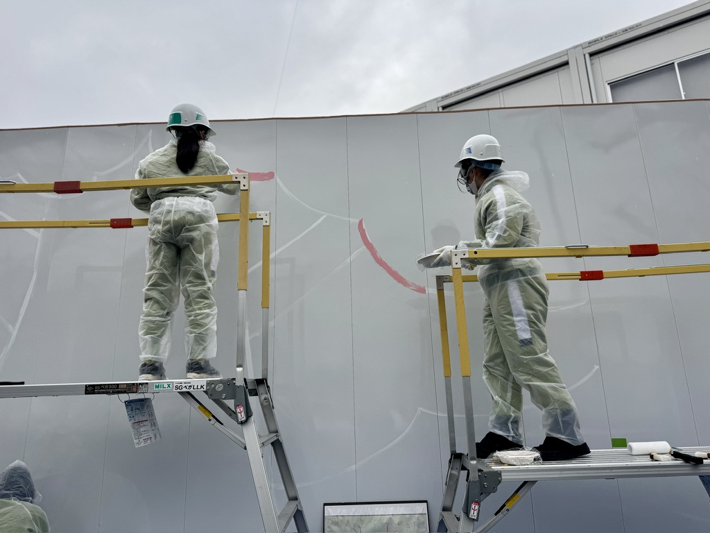 新庁舎という街の新しいシンボルができる過程で生まれた、このウォールアート。生徒たちの瑞々しい感性と、それを見守り支える大人たちの優しさが重なり合う、地域の絆を感じるプロジェクトとなりました。